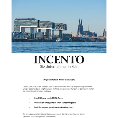 Mit einem überarbeiteten Konzept für die Mitgliedschaft im branchenexklusiven Netzwerk INCENTO - Die Unternehmer in Köln starten die Netzwerkpartner in das Jahr 2026. "Wir möchten mit professionellen Leistungen zu günstigen Tarifen überzeugen", beschreibt Initiator Axel Hollander die Ausrichtung. Denn gerade in schwierigen Zeiten steht für viele Unternehmen der Austausch mit Partern aus anderen Branchen und die gegeseintige Empfehlung besonders im Fokus. "Wer mehr über die Konditionen und die Leistungen erfahren möchte, sendet einfach eine Mail an a.hollander@incento-magazin.de. Wir senden umgehend das ausfhrliche Konzept 2026 zu."